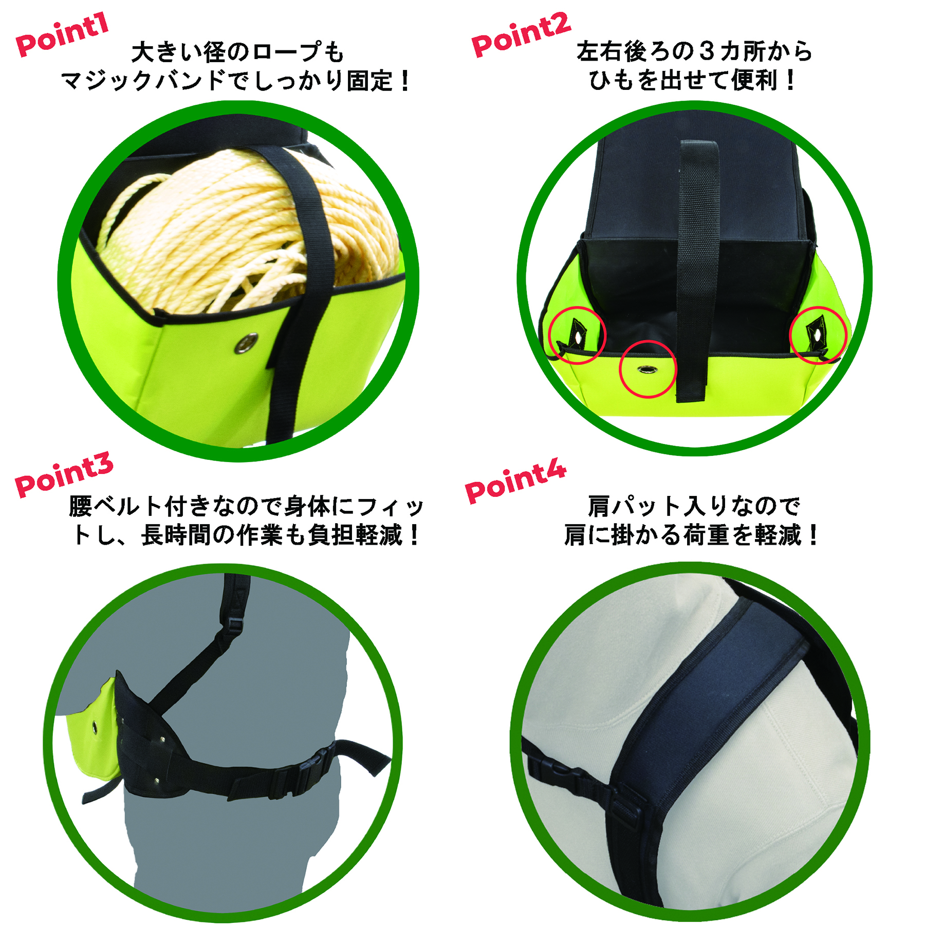 背負いやすく工夫された肩ベルトと腰ベルトにより、荷重を分散し、長時間の作業でも負担が軽減されます。