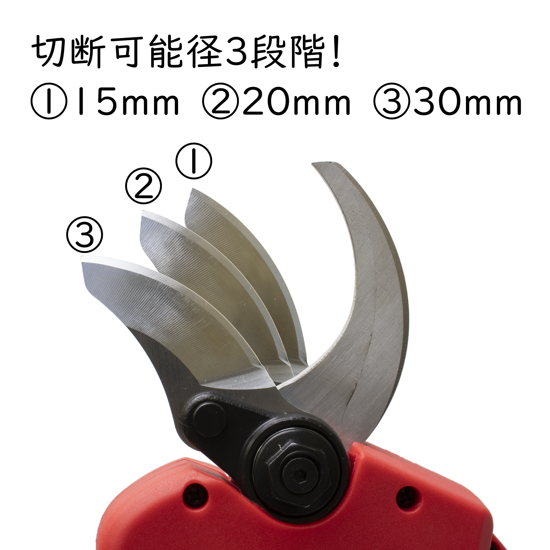 切断径φ15mm、20mm、30mmの3段階式電動剪定鋏です。