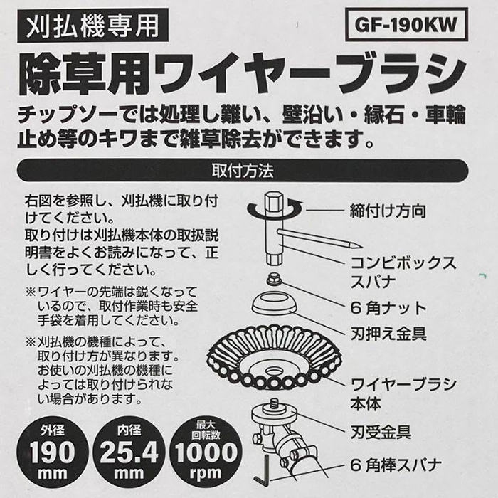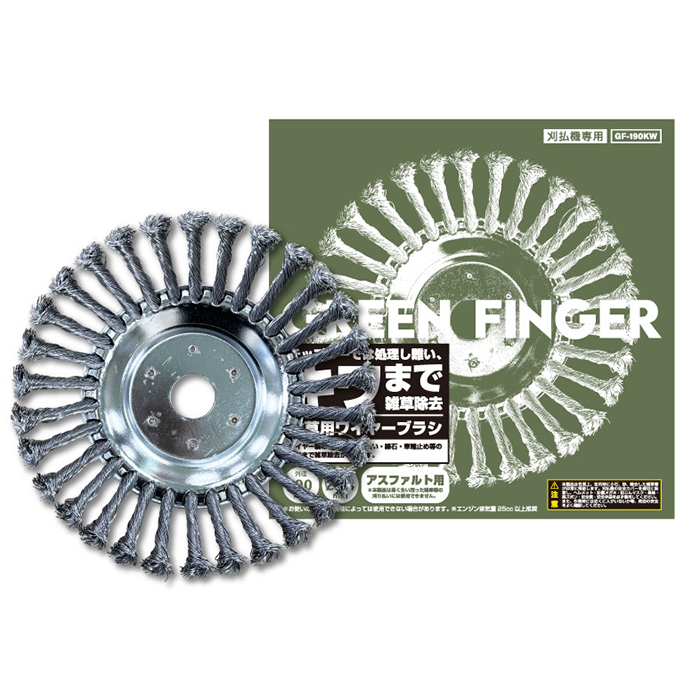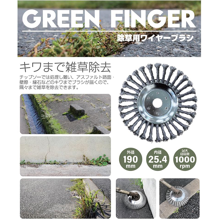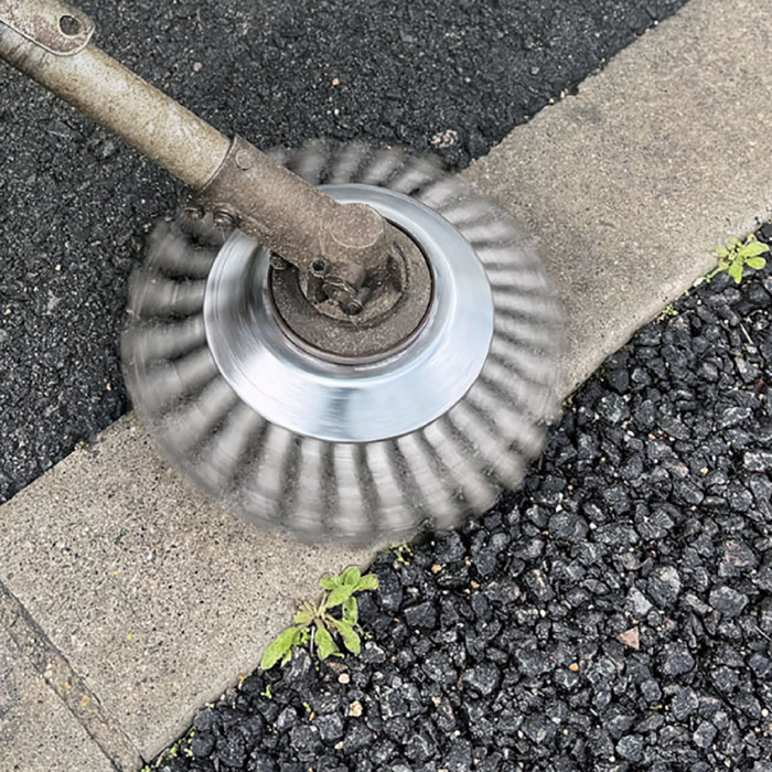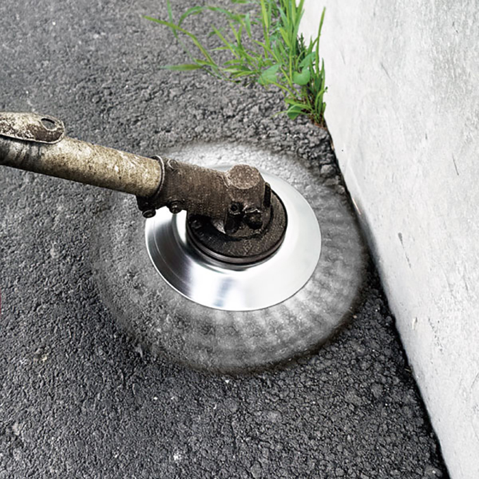 チップソーでは処理し難い、 アスファルト路面・壁際・縁石などの キワまでブラシが届くので、 隅々まで雑草を除去できます。 ◎刈払機に取り付けて使用してください